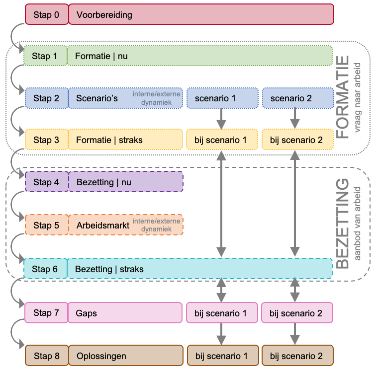 - het aanbod van arbeid (= bezetting), met als doel het in beeld brengen van de huidige en de beschikbare toekomstige kwaliteiten (de vlootschouw);