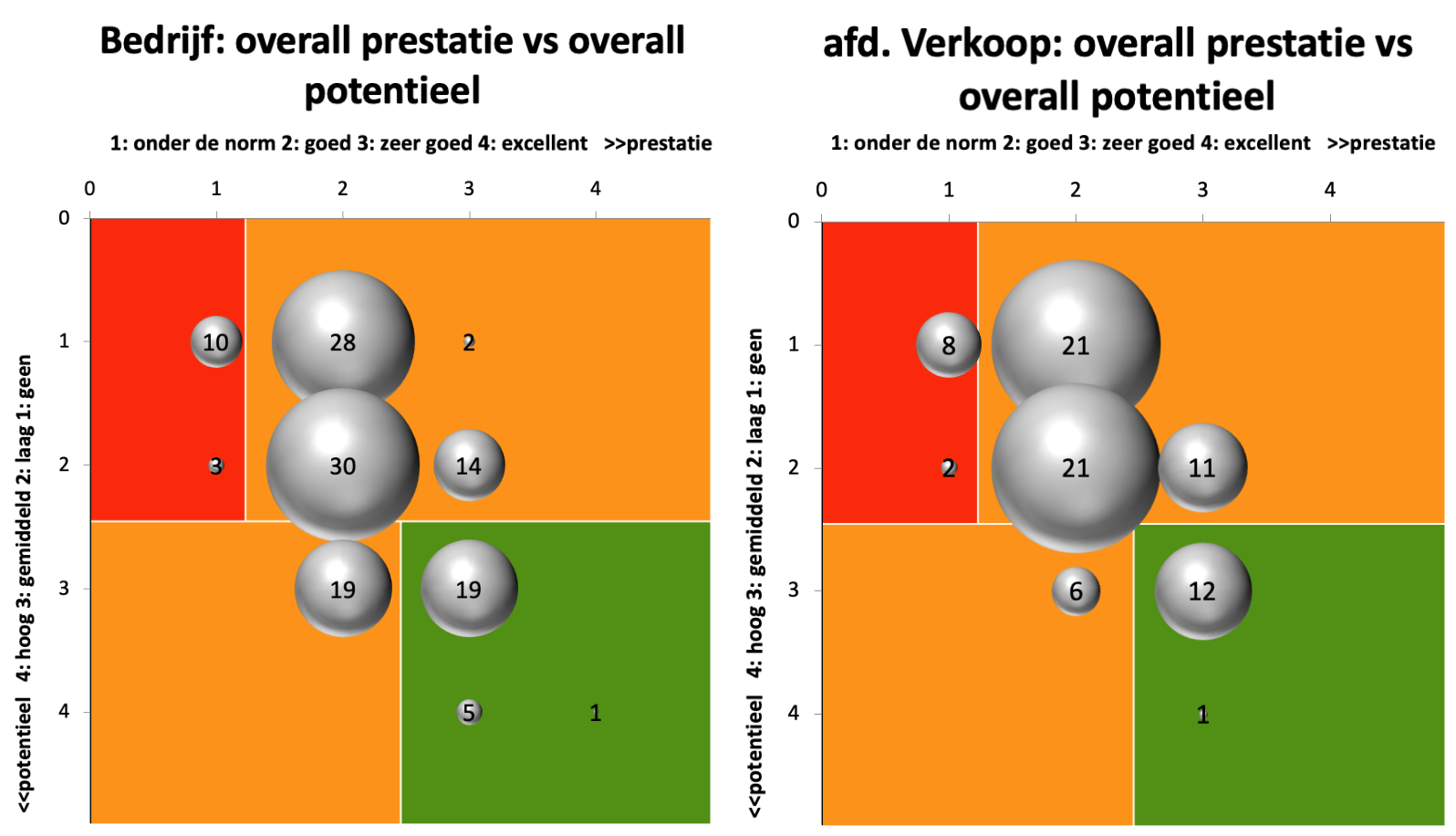 De uitkomsten komen samen in een matrix waarbij we gebruik maken van een matrix met het ‘Human Resources Performance Potentieel Portfolio' om medewerkers te positioneren. De analyse, die zowel op organisatieniveau als per afdeling of categorie medewerkers kan worden gemaakt, geeft daar antwoord op. De verkregen inzichten vormen de aanzet voor gerichte HR-interventies. Onder deze tekst vind je voorbeelden van overzichten uit de rapportage die we voor je kunnen maken. Ook hier geldt 'maatwerk': we presenteren overzichten en grafieken waar jij behoefte aan hebt.
